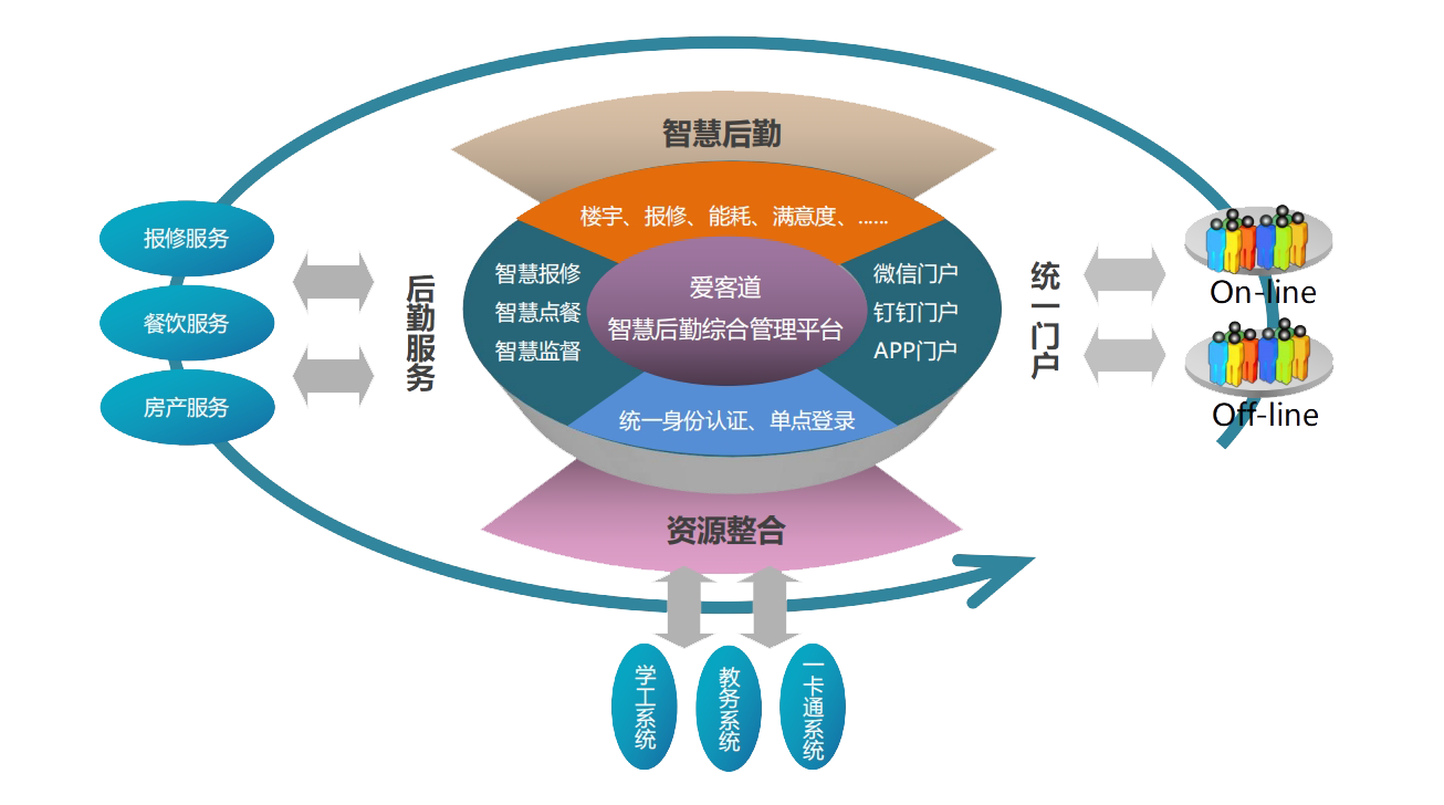 基于物聯(lián)網(wǎng)、大數(shù)據(jù)、數(shù)字孿生等技術(shù),通過整合后勤相關(guān)的人、財(cái)、物,及相關(guān)的制度、流程、事件,建立集統(tǒng)一調(diào)度、統(tǒng)一管控、統(tǒng)一數(shù)據(jù)和統(tǒng)一運(yùn)維的一體化智慧后勤,為高校、醫(yī)院等群體提供辦公、會(huì)議、任務(wù)、房產(chǎn)、設(shè)備、資產(chǎn)、耗材、巡檢、保養(yǎng)、保潔、能耗、餐飲、滿意度、投訴等后勤服務(wù),保障運(yùn)行安全,提高工作效率,提升服務(wù)感受,降低運(yùn)營成本,突顯后勤管理價(jià)值。